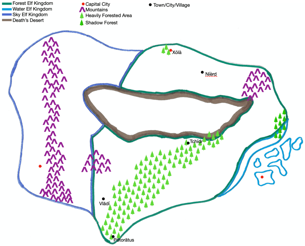 Though Brynn is no cartographer you can get a general sense of the 3 elfin kingdoms here! Capital cities for the Sky and Water Elves have not been named here yet as they are not part of “Cry of the She-Elf”